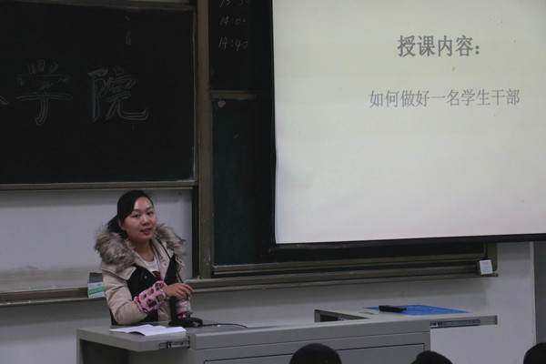 团委副书记杜昊婧老师就“如何做好一名学生干部”作为她的培训主题。“学生干部是学生群体中的先进分子,是学生工作的组织者,在学院学生工作中起着不可替代的作用。作为一名学生会干部,不仅要认真完成学生工作也要认真对待自己的学业,实现自身的全面发展。”此外,杜昊婧老师还对入党细则作了一些补充说明,让受训同学对如何入党、入党申请书的填写等有了更深层次的了解。