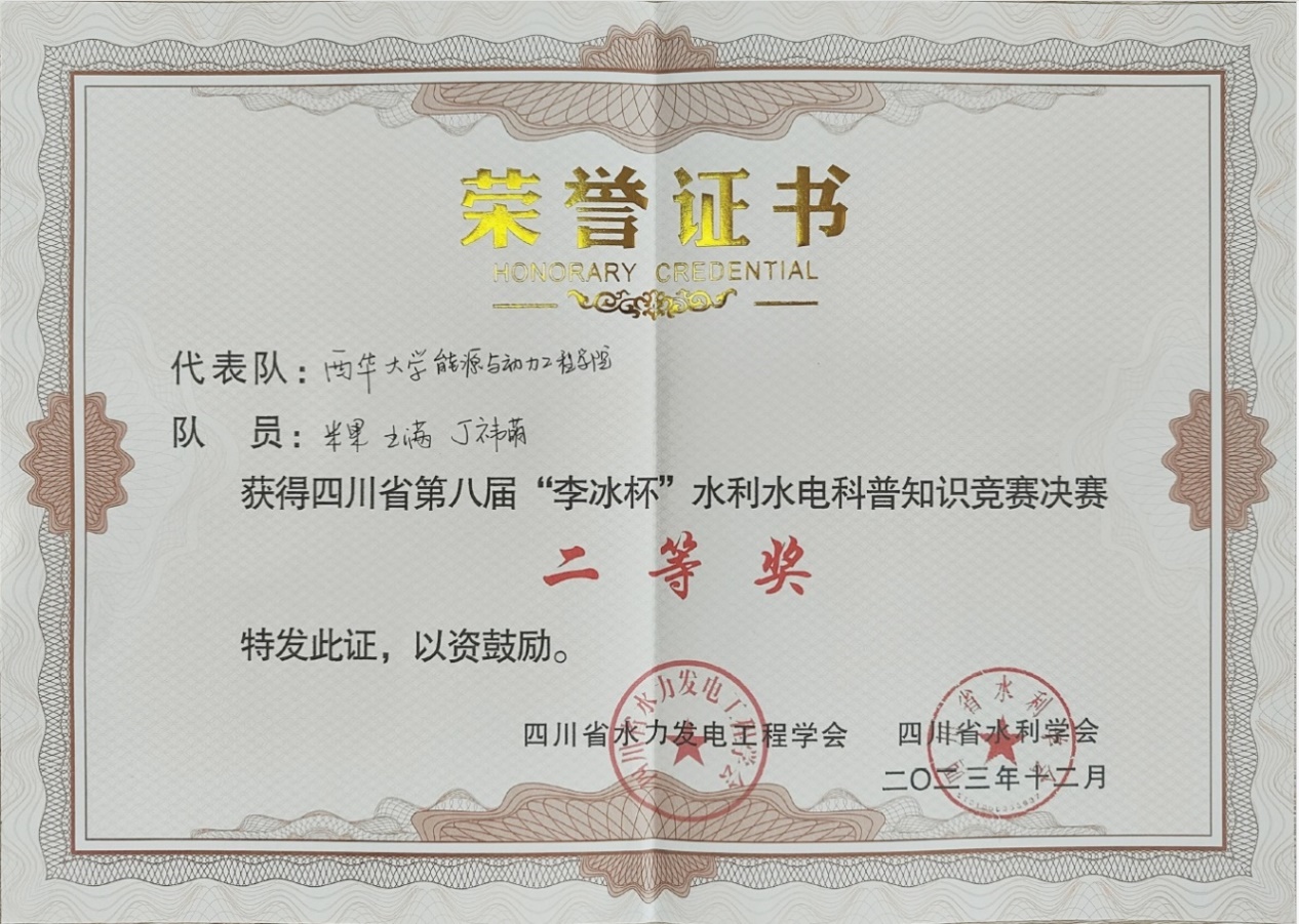 12月2日,由四川省水力发电工程学会与四川省水利学会联合举办的第八届“李冰杯”水利水电科普知识竞赛在四川大学望江校区圆满落下帷幕,来自四川大学、西华大学、四川农业大学等七所高校的代表队参加了此次竞赛。经过激烈的角逐,我校代表队凭借扎实的知识储备和出色的团队协作最终获得二等奖的好成绩。