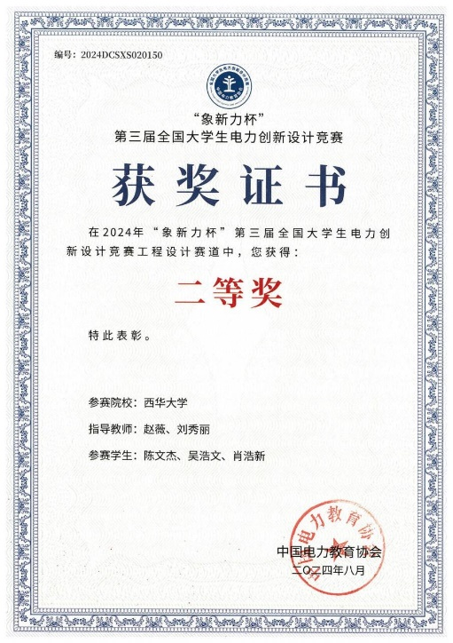 近日,由中国电力教育协会主办的“象新力杯”第三届全国大学生电力创新设计竞赛决赛在上海电力大学举行。经初赛选拔,大赛开放创新赛道、工程设计赛道共有289件作品进入决赛进行比拼。在决赛中,由我校能动、电气学院联合组建的研究生团队(覃书波、黄恩、杨杰)荣获全国一等奖,电气学院本科生团队(陈文杰、吴浩文、肖浩新)荣获全国二等奖,张力副教授被授予“优秀指导教师”称号。
