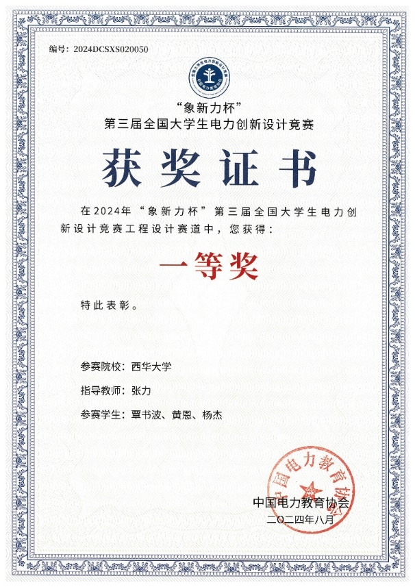近日,由中国电力教育协会主办的“象新力杯”第三届全国大学生电力创新设计竞赛决赛在上海电力大学举行。经初赛选拔,大赛开放创新赛道、工程设计赛道共有289件作品进入决赛进行比拼。在决赛中,由我校能动、电气学院联合组建的研究生团队(覃书波、黄恩、杨杰)荣获全国一等奖,电气学院本科生团队(陈文杰、吴浩文、肖浩新)荣获全国二等奖,张力副教授被授予“优秀指导教师”称号。