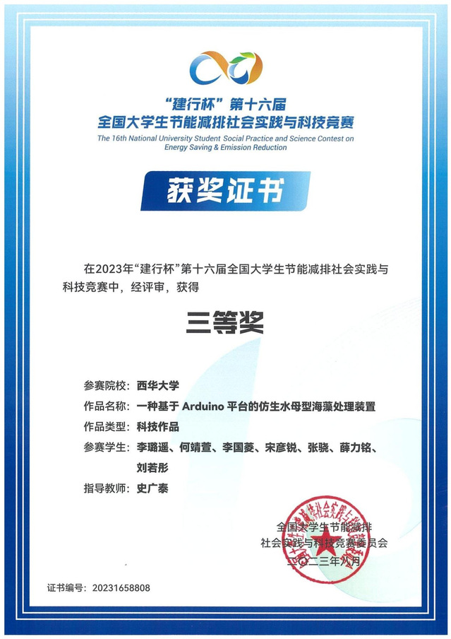种基于Arduino平台的仿生水母型海藻监测装置史广泰李路遥、何靖萱、李国菱、宋彦锐、张骁、薛力铭、刘若彤全国三等奖
