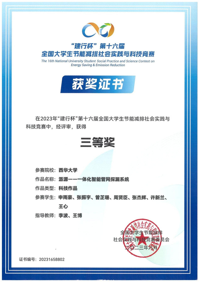 沥源——一体化智能管网探漏系统李波、王博申雨豪、张振宇、曾芷珊、周贤臣、张杰辉、许新兰、王心全国三等奖
