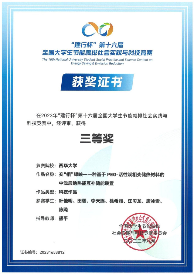 “相”辉映—一种基于PEG-活性炭相变储热材料的中浅层地热能互补储能装置熊平叶佳明、田馨、李天赐、徐希雅、汪习龙、唐冰雪、陈飐全国三等奖