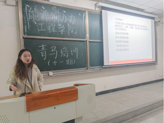 培训开始,全体起立奏唱团歌。紧接着古羽加老师从如何成为一名合格的学生干部的角度对同学们进行讲解。她要求学生干部一定要严格约束自己,尽心尽力服务同学,服务学院。同时她强调,学生干部要起到模范带头作用,要在将学习放在第一位的前提下,做到学习、工作和生活的兼容与配合,找到三者之间的平衡点。随后,她以自身经历从领导、工作、沟通和团队协作能力等方面对同学们进行讲解和要求,并着重强调了沟通能力与团队协作能力对于学生工作的重要性。