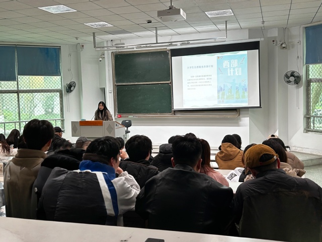 在宣讲会上,张老师围绕招募要求、服务方向及实施规划展开系统讲解。该计划重点面向应届高校毕业生及在读研究生群体,服务期通常为1至3年,覆盖教育支持、乡村建设、基层治理等核心领域,旨在搭建青年人才助力西部发展的长效平台。张老师结合国家战略导向,鼓励同学们到基层和人民中去建功立业,将个人职业选择与区域发展需求相结合,在扎根基层的实践中去实现自我价值。