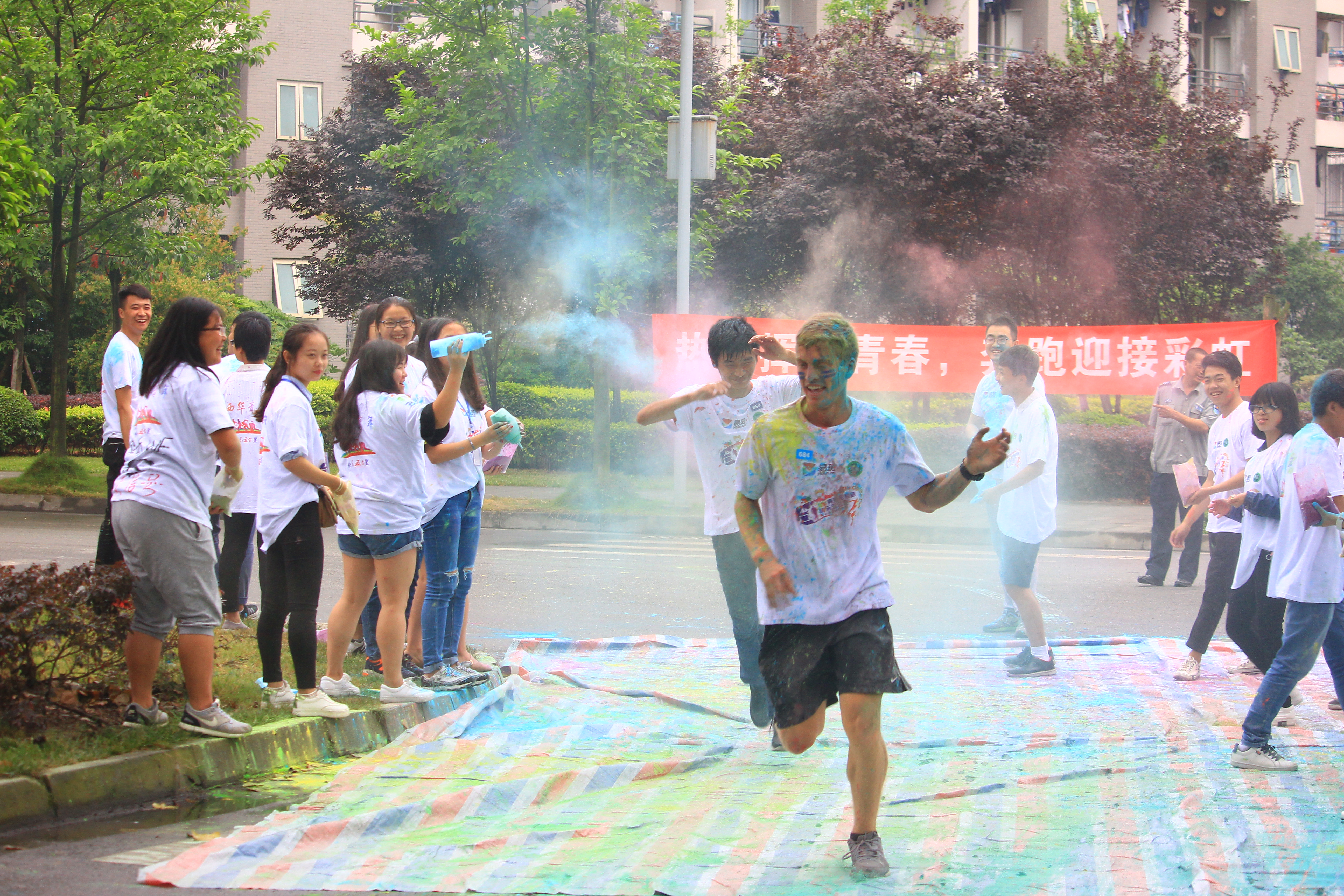 5月21日,由伟德国际1949等单位联合举办的“西华大学第二届彩虹跑”成功举行。本次活动全程5公里,沿途共设有5个“彩虹点”,当活动参加者经过各个“彩虹点”时,工作人员会向他们挥洒以玉米粉加染色剂所做成的“彩虹粉”。活动吸引了包括国际交换生在内的众多“西瓜籽”参与。