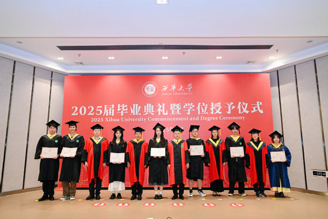 院党委书记徐元彬宣读授予学位决定。西华大学第五届学位评定委员会委员郎方年、学院学位评定分委员会主席徐元彬、副主席史广泰、委员刘晓辉、学院学术评定委员会主席江竹授依次为获得学位的毕业生拨穗正冠、授予学位证书,并与每一位毕业生亲切握手,并进行合影留念。