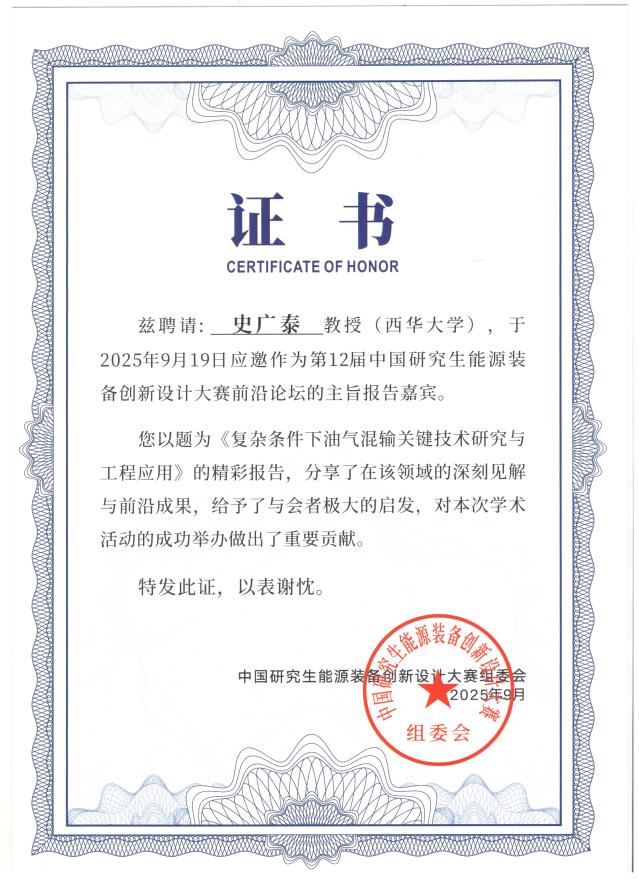 此次受邀作大会主旨报告,不仅是对史广泰教授及其科研团队长期深耕能源装备领域所取得成果的充分肯定,也进一步彰显了西华大学在能源动力学科建设、科技创新与产学研融合方面的综合实力与影响力,为推动我国能源装备技术进步贡献了“西华智慧”与“西华力量”。