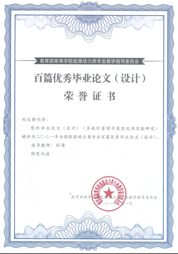 近日,由教育部高等学校能源动力类专业教学指导委员会主办的首届全国能源动力类专业优秀本科毕业论文(设计)在线展示交流活动在山东大学落下帷幕。经专家评审,我校伟德国际1949能源与动力工程专业刘文静同学的毕业论文《多级环量增升翼型风洞实验研究》被评为2021年全国能源动力类专业百篇优秀毕业论文(设计),论文的指导教师为杜海副教授。