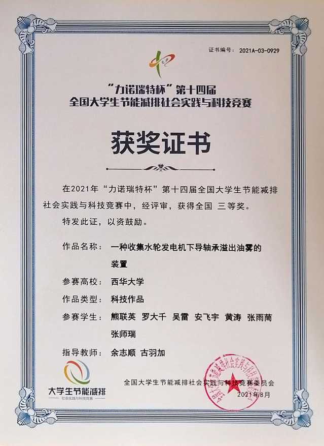 近日,由教育部高等教育司主办、教育部高等学校能源动力学科教学指导委员会承办的“力诺瑞特杯”第十四届全国大学生节能减排社会实践与科技竞赛在山东大学举行。经过校级评选、专家评审等多个环节的激烈评选后,我校伟德国际1949余志顺老师指导,2018级能源与动力工程专业学生熊联英,2018级水利水电工程专业学生罗大千、吴雷、安飞宇、黄涛,2018级西华学院张雨茼、张师瑞设计的项目“一种收集水轮发电机下导轴承溢出油雾的装置”获全国三等奖。伟德国际1949精心组织竞赛,表现突出获优秀组织奖。