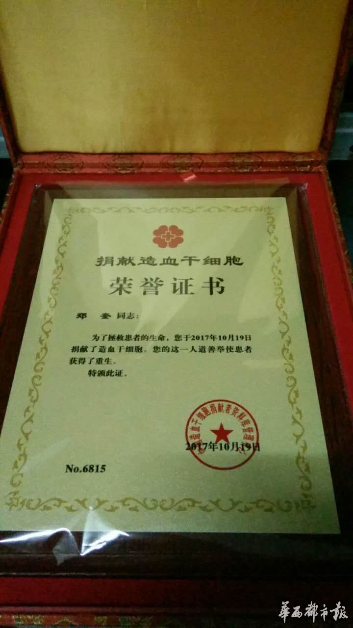 郑奎从红十字会得知受捐者是一位48岁的中年男子,他说:“尽管没见过面,但我很高兴自己能帮他,希望他能早日康复。”从郑奎体内采集的造血干细胞,不日将送达广东,为受捐者带去生命的希望。(李思浩 封面新闻记者 李寰)