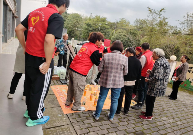 活动现场暖意融融。志愿者们提前协助工作人员搭建表演场地,细心搀扶行动不便的老人入座,并带来精心设计的互动游戏,引得现场欢声笑语不断。社区准备的牛奶、水果等慰问品,经志愿者双手递至老人手中,弯腰示意的细节里满是敬意。分发间隙,他们不忘捡拾老人脚边杂物、扶正被风吹歪的宣传展架,默默打理着现场。