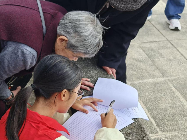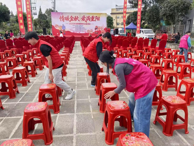 活动尚未开始,志愿者们已早早到场忙碌:摆放饰有牡丹纹样的红色座椅、悬挂“九九重阳节 浓浓敬老情”主题灯笼,见有行动不便的老人前来,便主动上前搀扶入座,耐心协助填写活动信息表。“这些娃忙前忙后,跟自家孩子一样亲!”72岁的李婆婆笑着称赞。