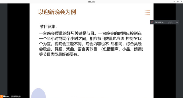接着,古羽加老师从学生会活动的策划、文件的书写规范两大方面正式开始了此次培训。她从校园活动开展的一般思路、学生会活动开展的一般思路、前期准备三大方面再结合迎新晚会为例对活动策划做了详细讲解。