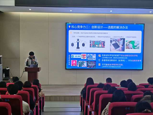 随后,上届国赛一等奖获奖团队“重力智控小队”代表刘正杰同学,结合自身参赛及作品打磨的实战经历,分享备赛经验。他从选题、可行性分析、效益分析、成果呈现四个方面,向同学们传递实用技巧,并嘱咐在场团队代表:选题需紧密贴合真实社会需求,创新点要做到独具匠心、令人眼前一亮;可行性分析要严谨扎实,以硬核数据支撑科研水平;效益分析需突出显著成效、直观易懂,同时要注重实践过程的真实性与可追溯性。这份干货满满的分享,为同学们提供了极具参考价值的实战策略,让大家受益匪浅。