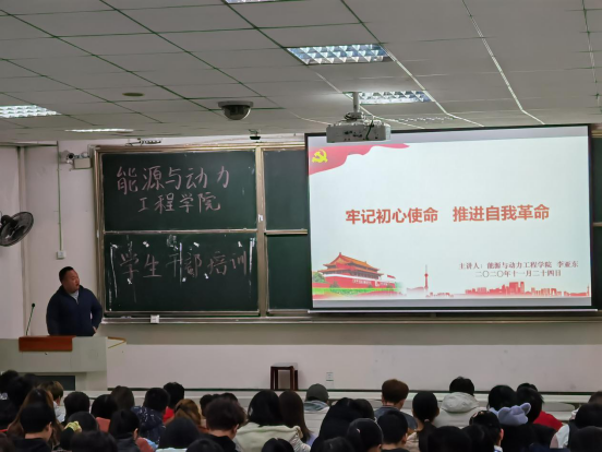 为引导学生干部自觉做学习贯彻习近平新时代中国特色社会主义思想的模范,不断增强中国特色社会主义道路自信、理论自信、制度自信、文化自信。3月24日,在4A104能源与动力工程开展一场“牢记初心使命,推进自我革命”主题教育活动,学院辅导员李亚东老师担任主讲人。