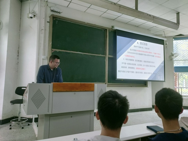 大会开始,辅导员李亚东详细讲述了本次考研交流会召开的目的、意义,以及我院今年考研的基本情况并邀请四位考研上岸的学长、学姐为同学们分享考研经验。紧接着,2018级学长、学姐(郭鑫、阙丽、陈建宇、王梓屹依次上台结合PPT分享了自身考研成功的宝贵经验。他们的侧重各有不同,从考研专业、院校的选择,专业课的复习,以及如何学好数学等统考科目给出了宝贵的建议,同时,还为学弟、学妹们共享学习资源,并说明了坚持与努力的重要性,强调了自信和冷静的心态是复试成功的关键。