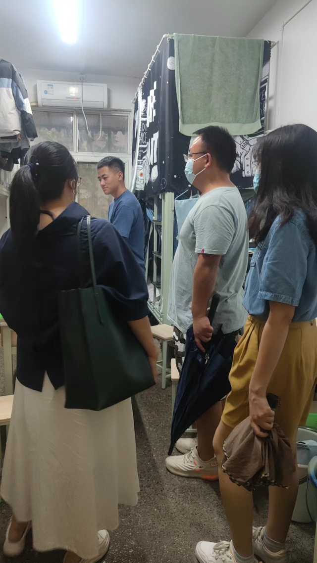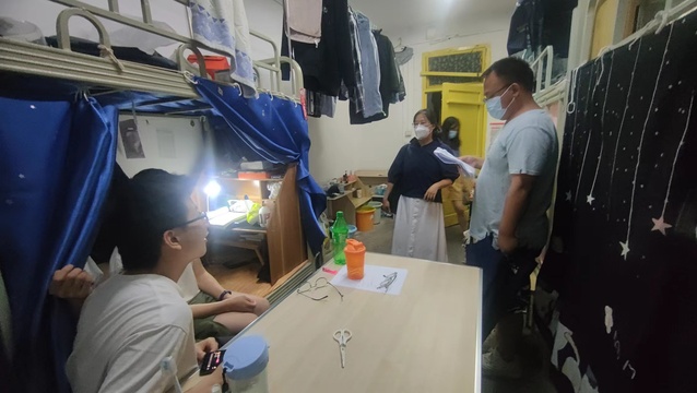2022年6月7日傍晚,党委副书记方晴、学工办主任张蓝月、分团委书记兼毕业班辅导员古羽加、2019级辅导员李亚东、2020级辅导员王希,对我院学生寝室进行了安全卫生大检查,初访各年级寝室文化建设工作开展情况。