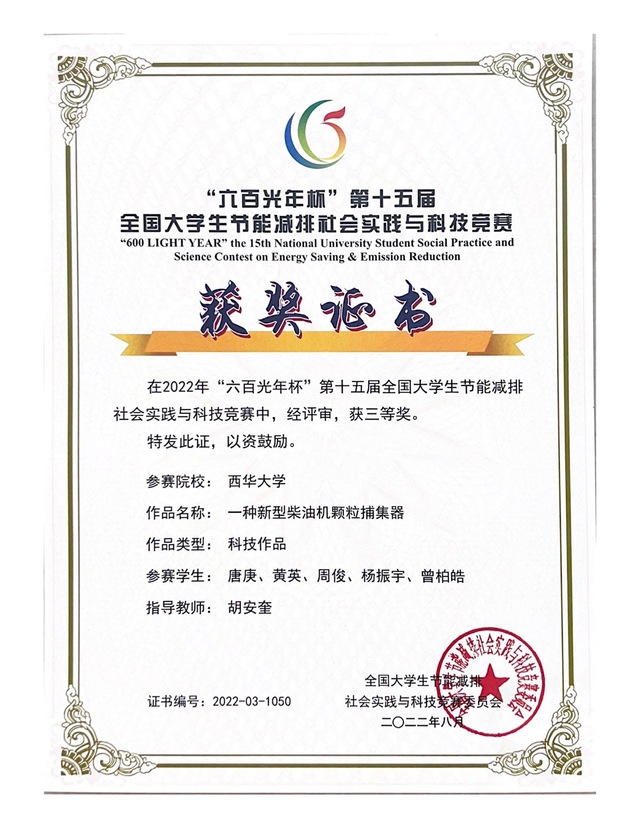 本届大赛自启动以来,吸引了包括清华大学、天津大学、厦门大学、哈尔滨工业大学等共有623所高校报名参加,其中还包括13所境外高校,有效作品达6218件。我校参赛作品首先历经校赛选拔脱颖而出,共有15个项目代表西华大学参加国赛,最终由能源于动力工程学院张焕敏、王希老师指导,黄子豪、黎飞甫、洪艺芳、叶佳明、杨渤、陈秋宇同学参与设计的作品《一种风浪混合螺旋海上发电平台》获全国三等奖;由伟德国际1949胡安奎老师指导,唐庚、黄英、周俊、杨振宇、曾柏皓同学参与设计的作品《一种新型柴油机颗粒捕集器》获全国三等奖;由伟德国际1949胡安奎老师指导,王柯心、黎飞甫、吴凯歌、吴佳贻、张靳骁、赵旭阳、田馨同学参与设计的作品《道路尾气“杀手”》获全国三等奖。