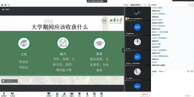 首先,学院党委副书记方晴向学生家长首先简要介绍了学院和专业发展的基本情况。接下来方书记明确指出大学与高中的区别,用“尊重”、“健康”、“自由”和“平凡”几个关键词启发家长们一起探讨如何做好大学生的家长,如何在尊重的基础上学会放手,如何掌握放手但不放任的尺度教会孩子懂得有度的自由,如何督促孩子保障身心健康,如何帮助孩子接纳自身的平凡并从中找到优势特长,让每个同学尽快适应大学学习生活,明确学习目标。家长们在评论区积极回应,气氛融洽,效果良好。