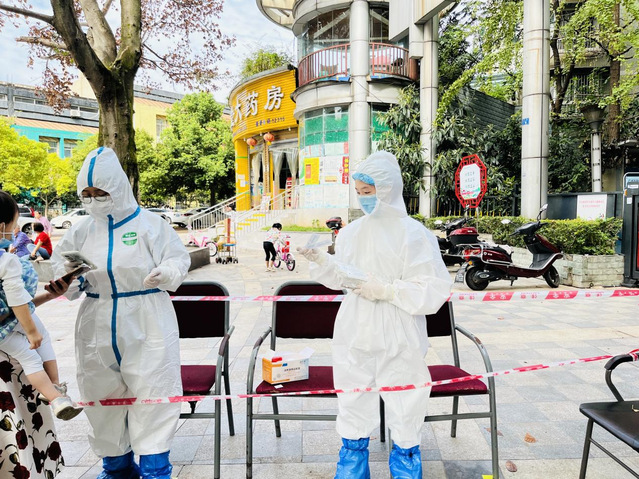 在校外,中共党员詹开棚作为一名社区志愿者,在眉山市东坡区东湖社区开展疫情防控工作。他主要负责与街道各商铺进行沟通,一方面向他们强调疫情防控的重要性,另一方面也督促各商店做好顾客进入门店佩戴口罩场所码、测温、亮行程码的日常管理预备党员罗晴积极加入宜宾市社区防疫工作队伍。在宜宾市进行全员核酸的前一天罗晴主动向社区报名参加核酸检测点的布置。在核酸检测期间,她穿上防护服,戴好防护口罩,走进疫情防控一线,进行社区居民的信息录入和维持秩序的工作,一站就是十几个小时。“这是一节特殊的、有意义的党课”,罗晴说。