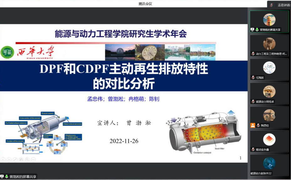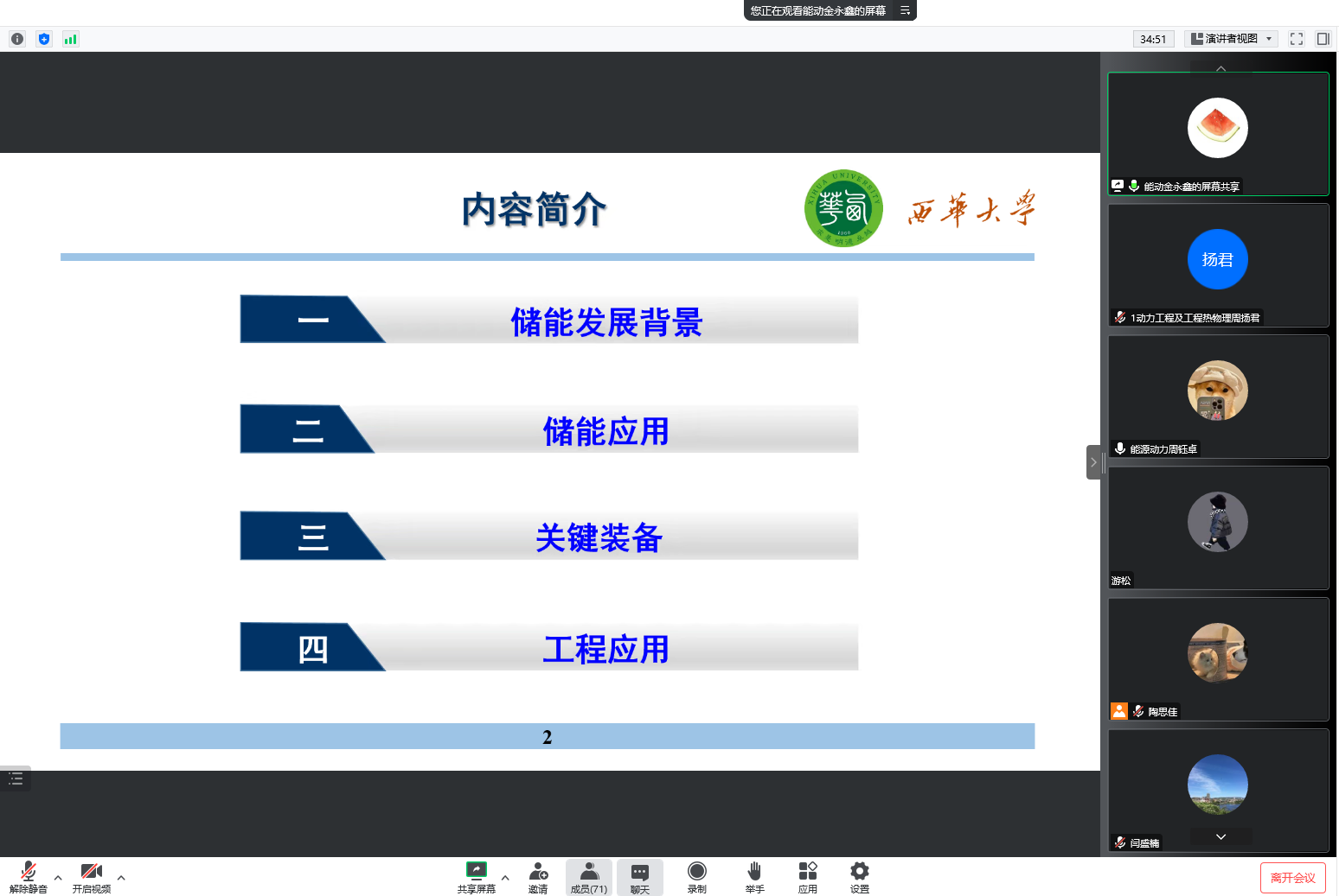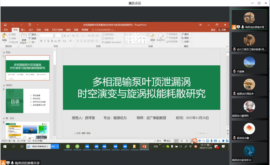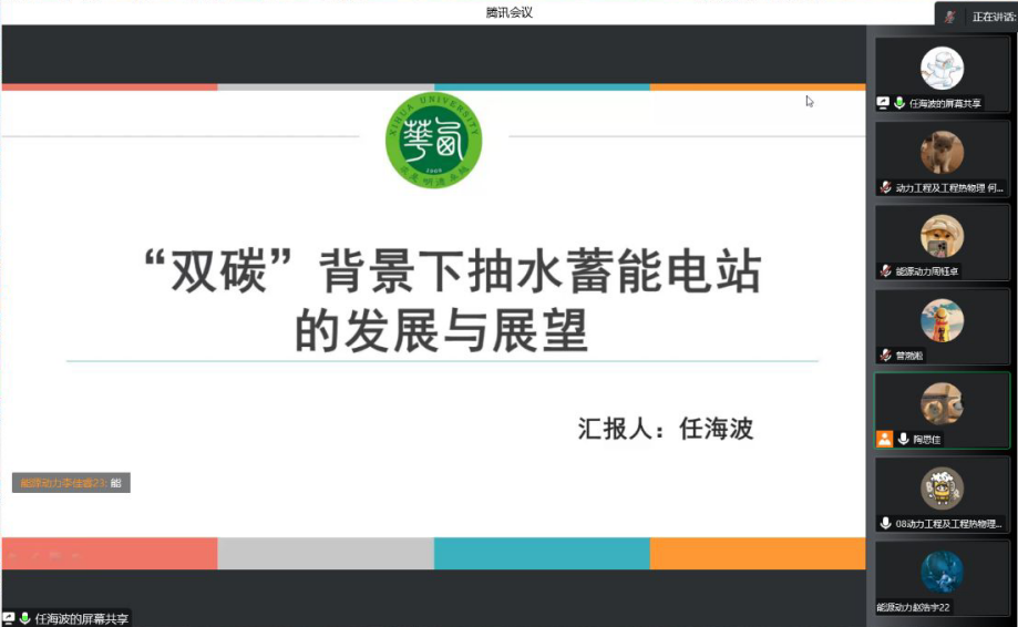 首先由两位老师带来学术分享,其中闫盛楠博士的报告主题为“探赜新能源—锚定双碳目标筑梦绿色未来”,金永鑫博士围绕储能发展背景、储能应用、关键装备、工程应用方面讲述“储能发展趋势与关键装备技术”主题内容。然后由三位研究生进行学术汇报,分别分享了他们所研究的科研项目内容和进展,包括舒泽奎的多相混输泵叶顶泄漏涡时空演变与旋涡拟能耗散研究、曾渤淞的DPF和CDPF主动再生排放特性的对比分析、任海波的“双碳”背景下抽水蓄能电站的发展与展望。