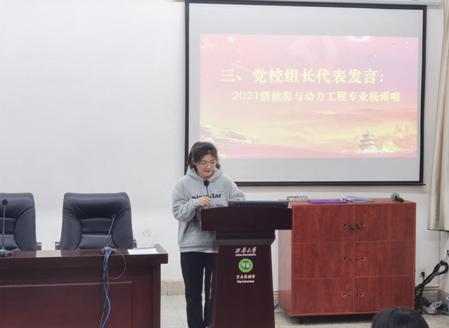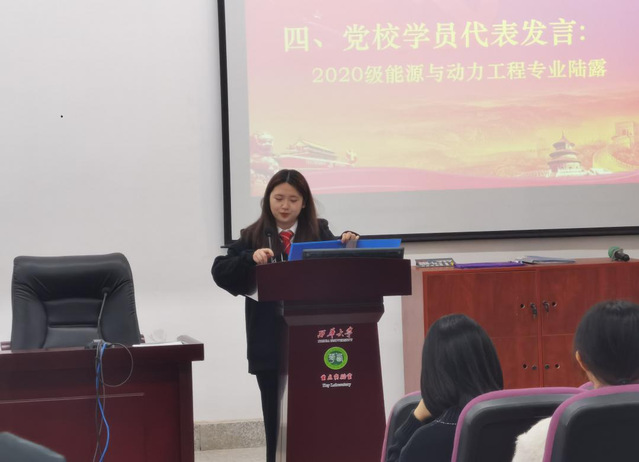 学院第49期党校入党积极分子培训班学员代表、2020级能源与动力工程专业陆露同学进行发言。她在发言中提到,作为入党积极分子,要全心全意为学校服务、为同学们服务,在服务大家的同时,不断提高自己的能力。同时她还建议入党积极分子们应该在学习和生活中严格要求自己,努力端正自己的入党动机,认真学习和宣传党的方针路线,不断提高自己的政治意识;努力从细节中不断完善自我,坚定理想信念,时刻以一名党员的标准严格要求自己。
