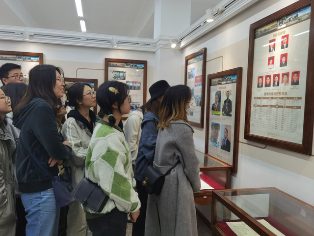 在参观校史馆的过程中,学员们一边仔细聆听讲解员饱含深情的讲解,一边观看着校史馆展出的展品。展馆陈列室里,展品陈旧、照片泛黄,仿佛在无声的向前来参观的学子们展示着西华一甲子的发展历史。更让人难以置信的是,校史馆的“创业厅”是以时间为轴,通过图片、文字、视频和实物相结合的方式,展示了学校在不同历史发展时期的奋斗历程。而“奋进厅”在图片、文字和实物的基础上,配以电子设备,展示了学校自成立以来的奋斗历程、办学特色和办学成就。一张张老照片、一个个老故事,承载着一代又一代西华人的时代记忆,他们带着“求是、明德、卓越”的校训穿越时光带来的感动。