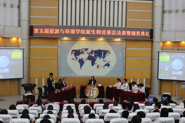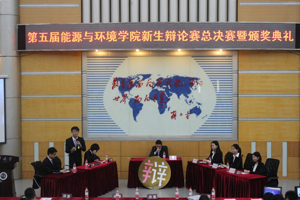4月18日晚7:00,能源与环境学院第五届新生辩论联赛决赛暨颁奖典礼在四教报告厅隆重举行。出席本次活动的有沈隽湘老师、学院辩论队及其他学院辩论队领队。经过一个月的精彩角逐,2013级建环1班和2013级给排水1班在16支参赛队中脱颖而出,打进决赛。