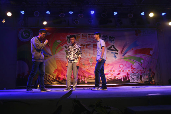 宋文武首先致辞,他向进入能环学院的学子们致以衷心的祝贺与热烈的欢迎。台下如潮水般的掌声响起,迎新晚会在一首《真的爱你》中拉开了帷幕。2014级环境工程专业的同学自编自导的小品《大学第一课》,以两位大一新生加入学生会为线索,在饶有趣味和跌宕起伏的故事情节中向观众们介绍了能环学院学生会组织的特点。在小品表演中,同学们以幽默演技逗乐了在场所有的观众。一曲悠扬婉转的萨克斯独奏《You make me smile 》把观众们带入了另一个宁静优雅的世界,观众们陶醉于其中,享受着音乐的盛宴。亮点不断,精彩纷呈,伴随着动感十足的音乐,身穿蓝色短袖、活力十足的能环学院啦啦操队员在舞台中央挥舞着花球,给观众们留下了永恒的美的享受。表演一场接着一场,场下掌声与欢笑不断。穿插于晚会过程之中的两次知识抢答和三次微博墙抽奖活动也为晚会增添了喜悦的气氛。整场晚会精彩与惊喜交织,在场观众也都纷纷拿起手机参与晚会节目互动。