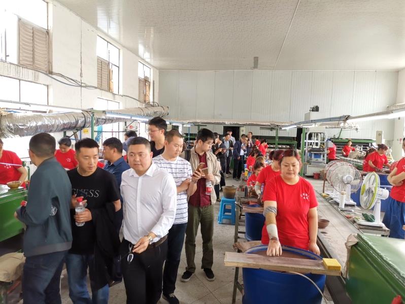 四川仁寿越峰瓷业有限公司前身系地方国营仁寿县瓷厂,始建于康熙五年(1666年),距今已有300余年日用瓷生产发展历史。上午11:00,在该公司负责人欧波的带领下,学院教师参观了陶瓷生产线。他介绍说,陶艺工序繁杂、工艺要求极高,一般需要经过选料、研磨、挤滤、练泥、辊压成型、修坯、贴花、上釉、烧制、检测、产品成型等十几道工序,公司实现了传统手工和现代数控技术的有机融合。他还讲述了碗碟等日常陶瓷用品起源的民间传说,介绍了古人超高的智慧和精湛的工艺水平。